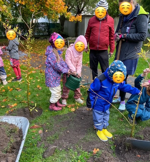 Wir haben in unserer Kita mehrere Apfelbäume. Und die Apfelernte dieses Jahr war gigantisch. Wir konnten täglich im Garten frisch gepflückte Äpfel aufschneiden und naschen. Wir haben in der Kinderküche leckeren Apfelcrumble gebacken. Bei den Bambini-, Schnatterenten- und Zwergen-Treffen ging es ganz oft auch um den Apfel. Das Eichhörnchen Fritzi hat z.B. aus dem Buch „Schüttel den Apfelbaum“ vorgelesen und die Kinder mit Bewegungsreimen, Pustespielen und Farbenmischen erfreut. Bei der Schnatterente und dem Zwerg haben die Kinder die Geschichte von den vier Freunden Eule, Felix, Hoppel und Nuss das Eichhörnchen gehört, welche eine Apfelfangmaschine gebaut haben. Die Kinder konnten bei einem Quizz rund um den Apfel alle Fragen beantworten. Es wurden Apfel-Sonnenfänger gebastelt – ein schöner Fensterschmuck. Unser kleines Reh Bambi hat den jüngsten Kindergartenkindern die kleinen Apfelstübchen im aufgeschnittenen Apfel gezeigt. Sie haben das Lied „In einem kleinen Apfel“ gesungen und mit den kleinen Äpfeln und Farbe bunte Bilder gestaltet. Smila und ihr Papa haben mindestens 10 Stiegen voller selbst geernteter Äpfel an einem Sonntag zur mobilen Apfelquetsche gefahren und jede Menge Kartons mit frisch gepresstem Apfelsaft wieder in die Kita gebracht. Es gab eine feierliche Apfelsaft-Verkostung. Ein weiteres tolles Highlight im Herbst war die Baum-Challenge. Das „Team Demokratie Pegau“ wurde für die Baum-Challenge nominiert und hat die Herausforderung angenommen, innerhalb kurzer Zeit einen Baum zu pflanzen. Wir haben uns sehr gefreut, dass das „Team Demokratie Pegau“ bei dieser Aktion an unsere Kita „Sonnenschein“ gedacht hat. Die Kinder wussten natürlich schon bescheid, als das Team am Vormittag mit Schubkarre, Spaten, Pflanzerde und Weidenbäumchen angerückt kamen. So fanden sich schnell ein paar Kinder, die beim Setzen und Angießen der Bäumchen geholfen haben. Nebenbei wurden jede Menge Regenwürmer und Engerlinge vor dem Spaten gerettet. Wir freuen uns auf das wachsende Mini-Weidenwäldchen, wo auch in Zukunft hoffentlich noch viele Kinder spielen werden.